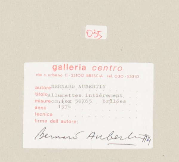 Bernard Aubertin, Allumettes intierement brulees, 1974 Fiammiferi bruciati su cartone, cm. 50x65 Firma sul retro. Etichetta della Galleria Centro, Brescia sul retro.