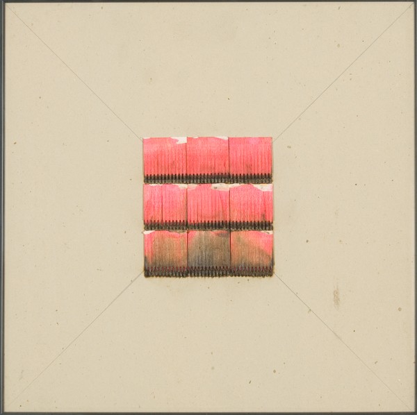 Bernard Aubertin, Jeu de feu, 1974 Fiammiferi su cartone, cm. 45x45 Firma sul...