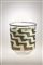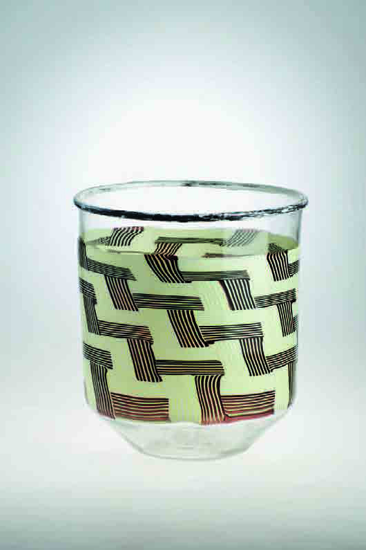 Benjamin Moore Vaso in vetro con alta fascia decorata a pezzi di tessuti a canne gialle, lattimo e marrone, 1978. Firma incisa: B Moore Venini 78, cm 31,5x28,5