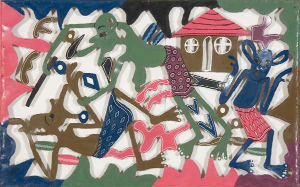 George Lilanga, Senza titolo, Olio su metallo decoupé, cm. 76x121 Firma in basso a sinistra. Provenienze: Studio dell'artista; Collezione Rosenfeld, acquisita direttamente dall'artista. Importante opera di George Lilanga eseguita su metallo decoupé, le più ricercate internazionalmente.