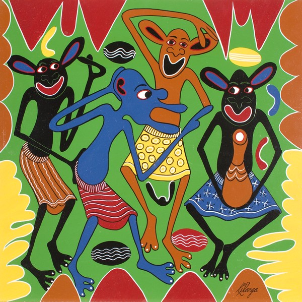 George Lilanga, Wewe umezoea vibaya sana kwa swala la uchoyo, 1998 Olio su tavola, cm. 61x61 Firma in basso a destra. Certificato di autenticità a cura della Felix Lorenz, Lauenburg (Elbe); parere verbale positivo a cura della National Gallery,Firenze.