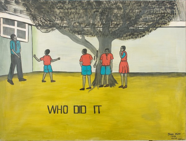 John Nzau, Who did it, 1999 Acrilico su tela, cm. 118x157,5 Firma in basso a destra. Opera esposta a Palazzo dei Sette, Orvieto nel 2000, alla Fabbrica Sarenco, Verona nel 2002 e allo Studio Brescia nel 2005..