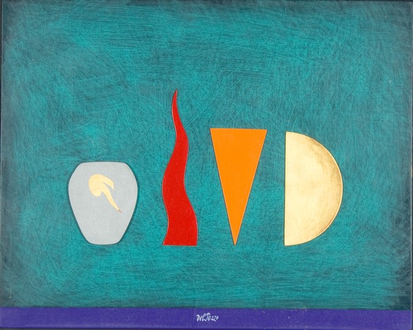 Lucio Del Pezzo, Progetto Ducati III, Collage e acrilico su tavola, cm. 40x50 Firma in basso al centro. Etichetta dello Studio d'Arte Aurelio Stefanini, Firenze sul retro.