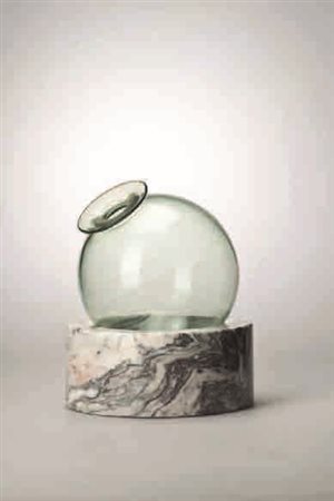 Ettore Sottsass Vaso “Luna” composizione di un vaso in vetro soffiato verdognolo su base cilindrica in marmo, 1997, cm 29x24