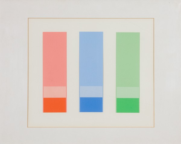 Antonio Calderara, Senza titolo, Collage e serigrafia su carta, cm. 29x34 Firma sul retro. Certificato di autenticità a cura della Fondazione Antonio e Carmela Calderara, Archivio n. 0107. Dichiarazione di autenticità a cura di Carmela Calderara sul retro.