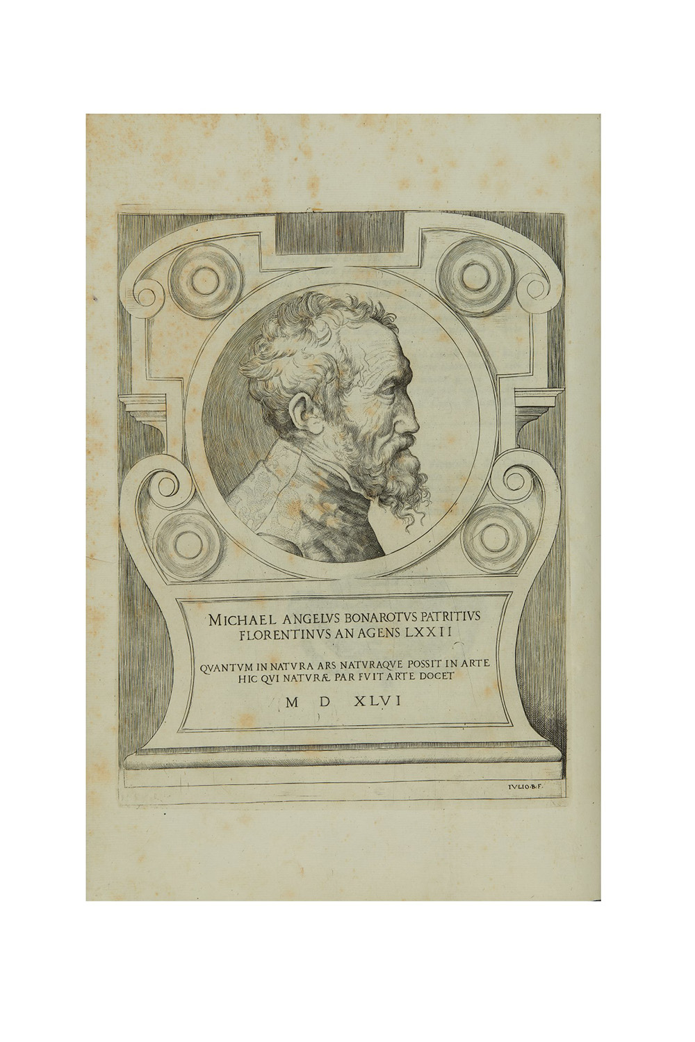 Folio (314 x 210mm). Occhiello, vignetta calcofrafica al frontespizio, ritratto di Michelangelo firmato Iulio B.F. e 3 tavole fuori testo, illustrazione a piena pagina e varie altre illustrazioni incise in rame nel testo (piccoli fori di tarlo ai margini delle ultime carte, occasionali lievi fioriture). Pelle coeva, tassello in marocchino rosso con titolo in oro al dorso, tagli rossi marmorizzati (lievi graffi). Provenienza: "Al Nobilissimo Signor Marchese Dante" (iscrizione antica all'occhiello) - Gustavo Galletti (1805-1868, editore; timbro sul frontespizio) - Pietro Toesca (1877-1962, storico dell'arte; ex libris).