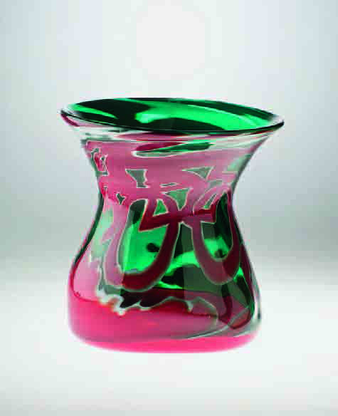 Owe Thorssen e Brigitta Karlsson Vaso in vetro verde decorato a motivi fitomorfi in rosso, collo svasato, 1972/1974, altezza cm 31,5
