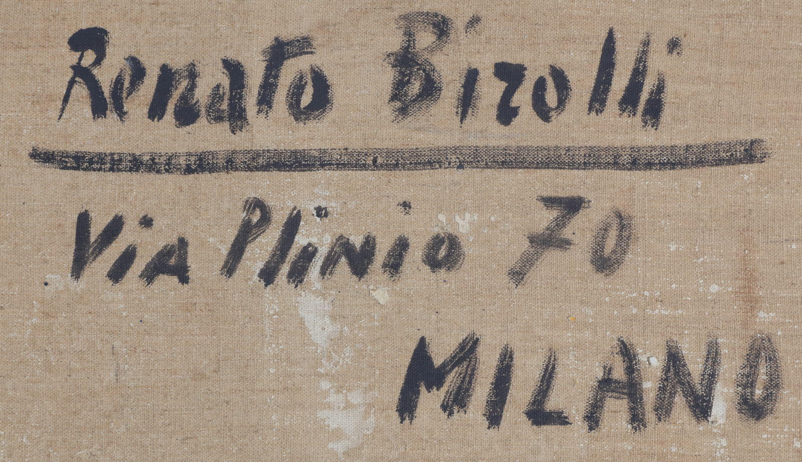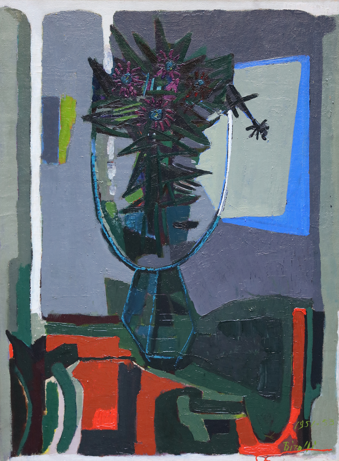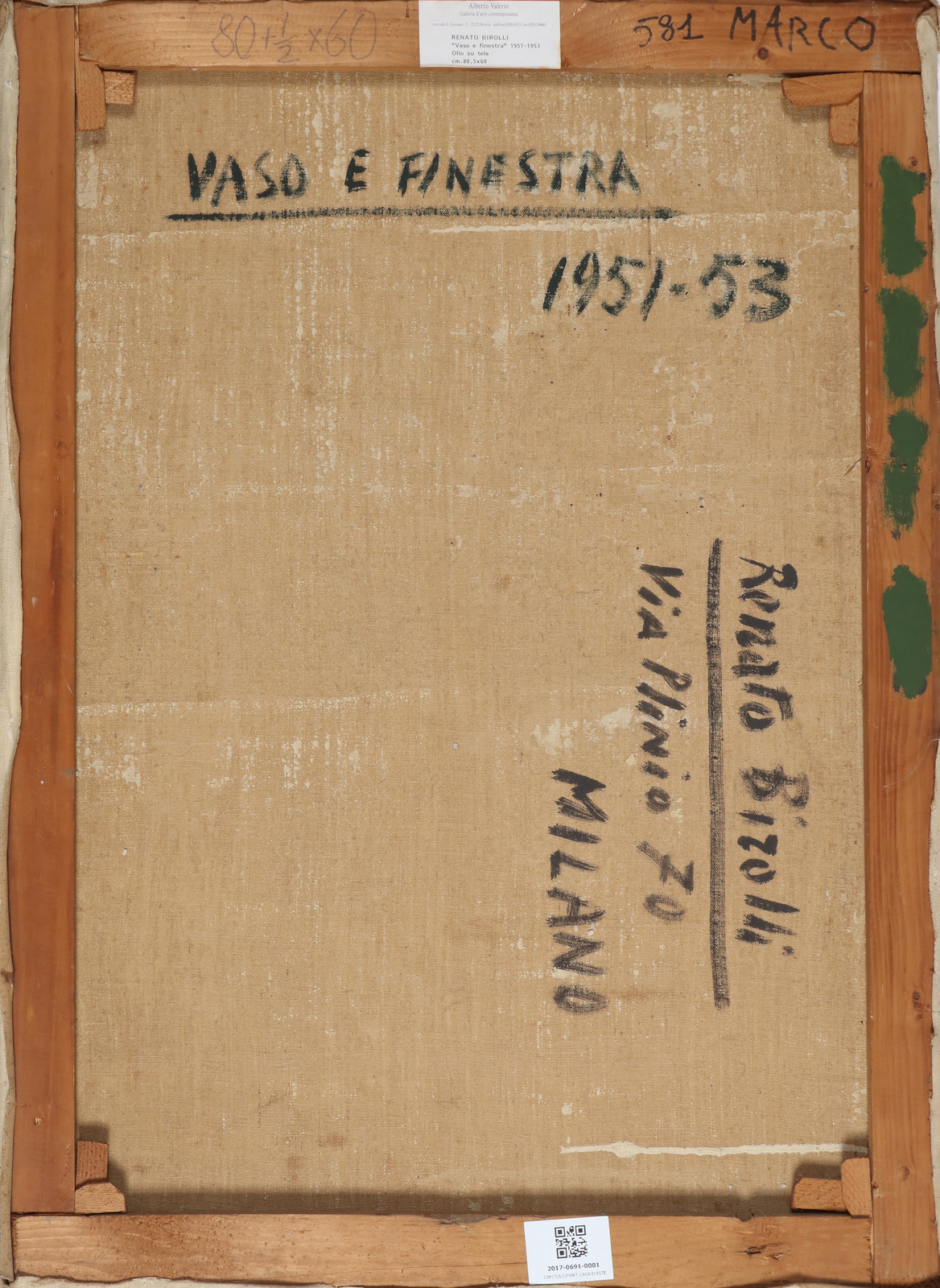 BIROLLI RENATO (1905 - 1959) Vase and window. Oil on canvas . Cm 60,00 x 80,50. Signature and year lower right. At the back title, signature and year. 1951-53. Pubblication: "Renato Birolli nelle collezioni bresciane" by Giovanna Capretti, AAB Editions, 2001; Birolli, General Catalog, Feltrinelli Editor, 1978, p.280, n.581. Provenance: Alberto Valerio Gallery, Brescia; Private Collection, Brescia. Cornice presente