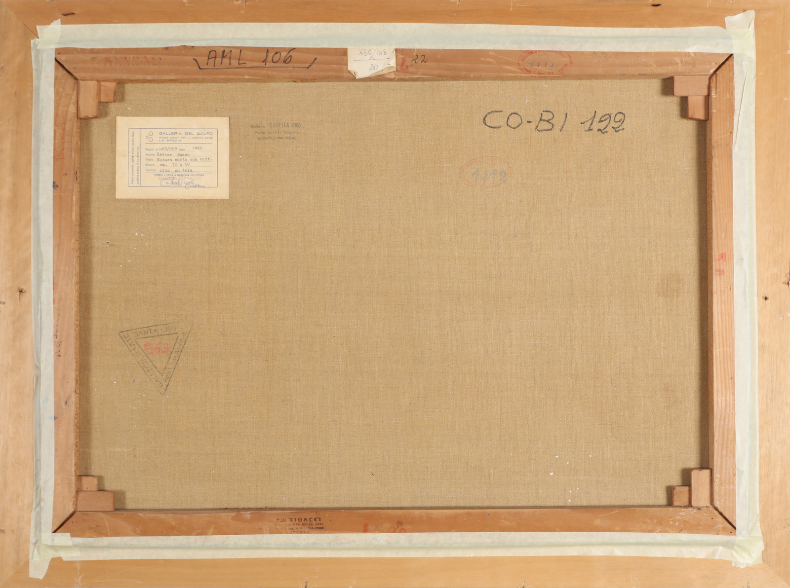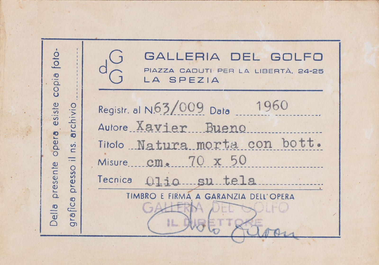 BUENO XAVIER (1915 - 1979) Still life with bottles and eggs. 1960. Oil on canvas . Cm 70,00 x 50,00. Signature upper left. At the back Golfo Gallery label and Saletta 2000 Gallery stamp. Telemarket authenticity certificate; Arte Capital provenance certificate. Pubblication: Xavier Bueno catalog, I Volume, Paolo Levi e Tommaso Bueno, Giorgio Mondadori Editor, 1993, pag. 130. Cornice presente