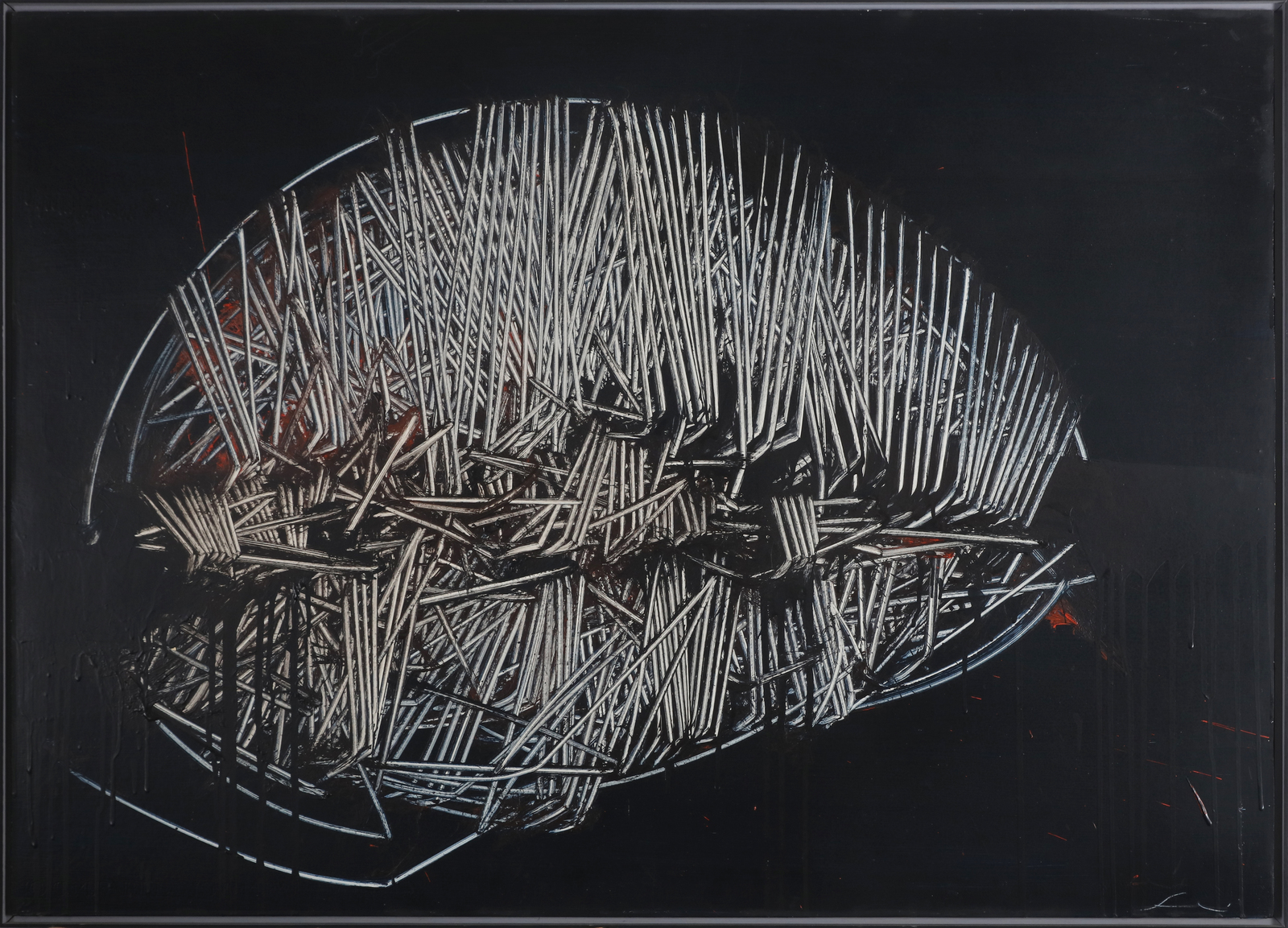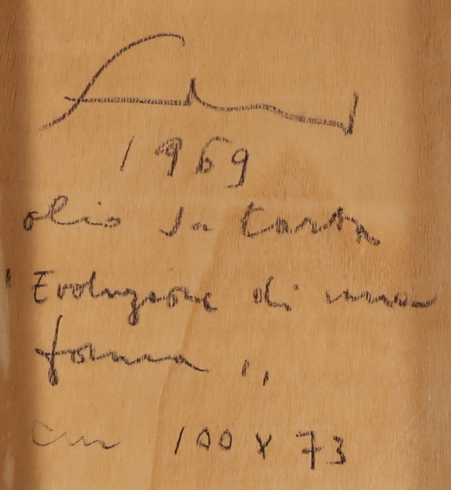 SCANAVINO EMILIO (1922 - 1986) Form evolution. 1969. Oil on cardboard on board. Cm 100,00 x 73,00. Signature lower right. At the back title, signature and year. Pubblication: Emilio Scanavino Catalog by Giorgina Scanavino and Carlo Pirovano, Electa Editor, 2000, Volume II, pag. 347, n.30.