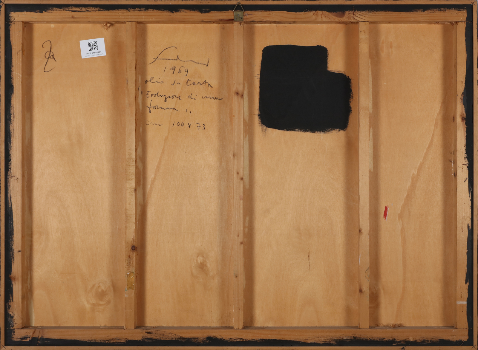 SCANAVINO EMILIO (1922 - 1986) Evoluzione di una forma. 1969. Olio su cartone su tavola. Cm 100,00 x 73,00. Firmato in basso a destra. Al retro titolo, firma e anno. Pubblicazione: Giorgina Scanavino, Carlo Pirovano, Emilio Scanavino, Catalogo Generale, Electa,. 2000, volume II, pagina 347, fig. 30.