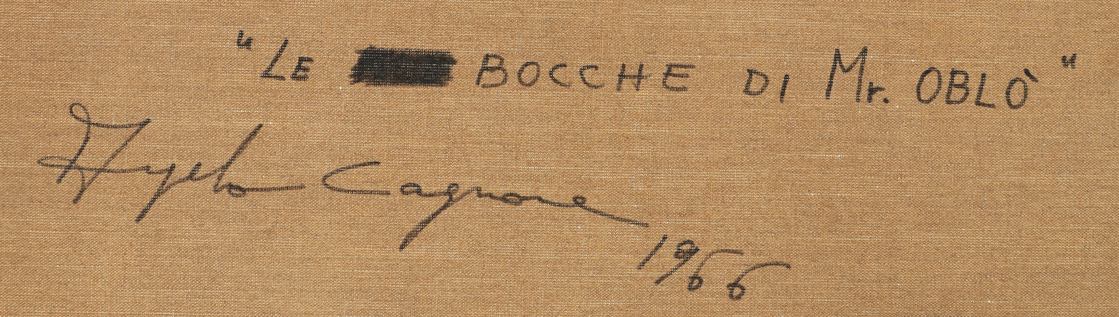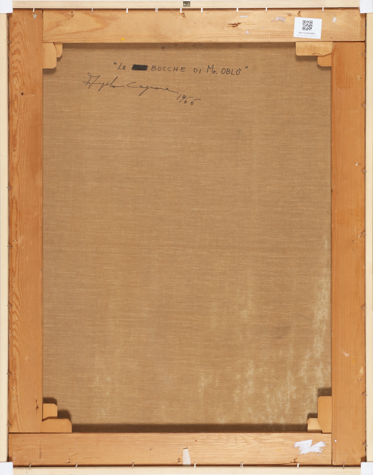 CAGNONE ANGELO (n. 1941) Le bocche di Mr. Oblò. 1966. Olio su tela . Cm 70,00 x 90,00. Al retro firma, titolo e anno. Autentica dell'artista su fotografia. . Cornice presente