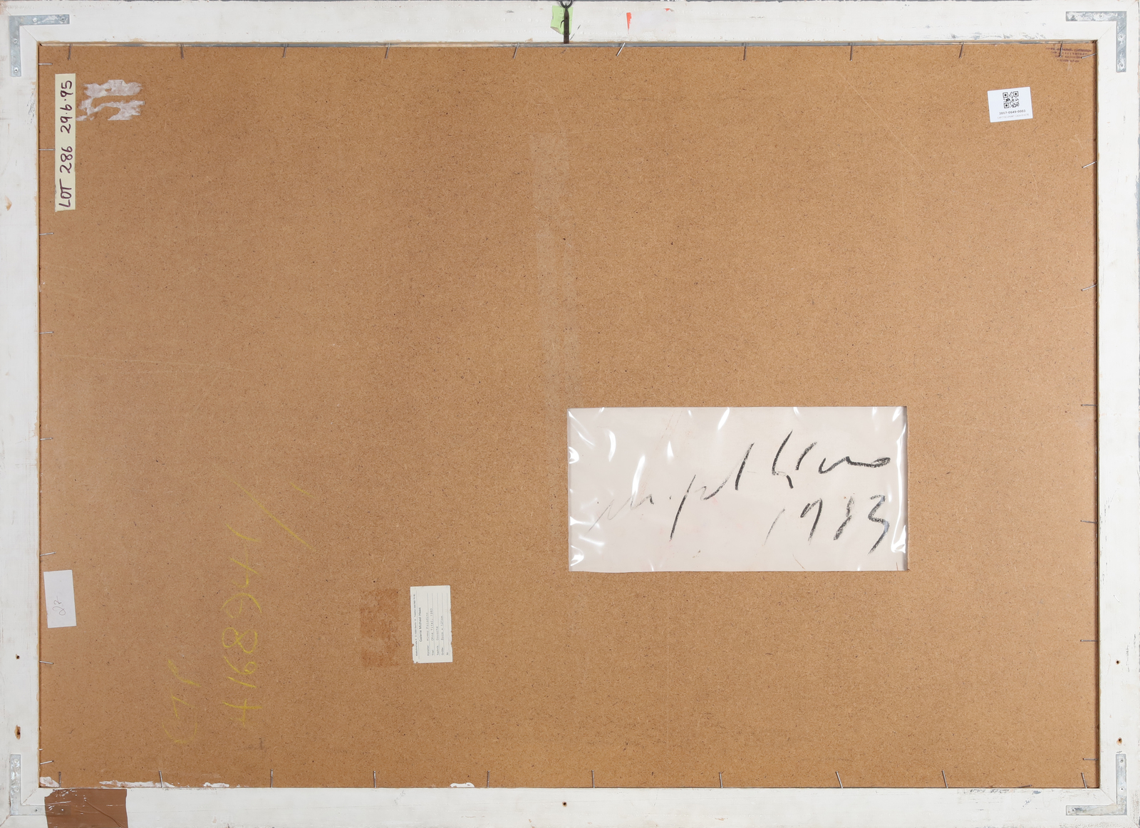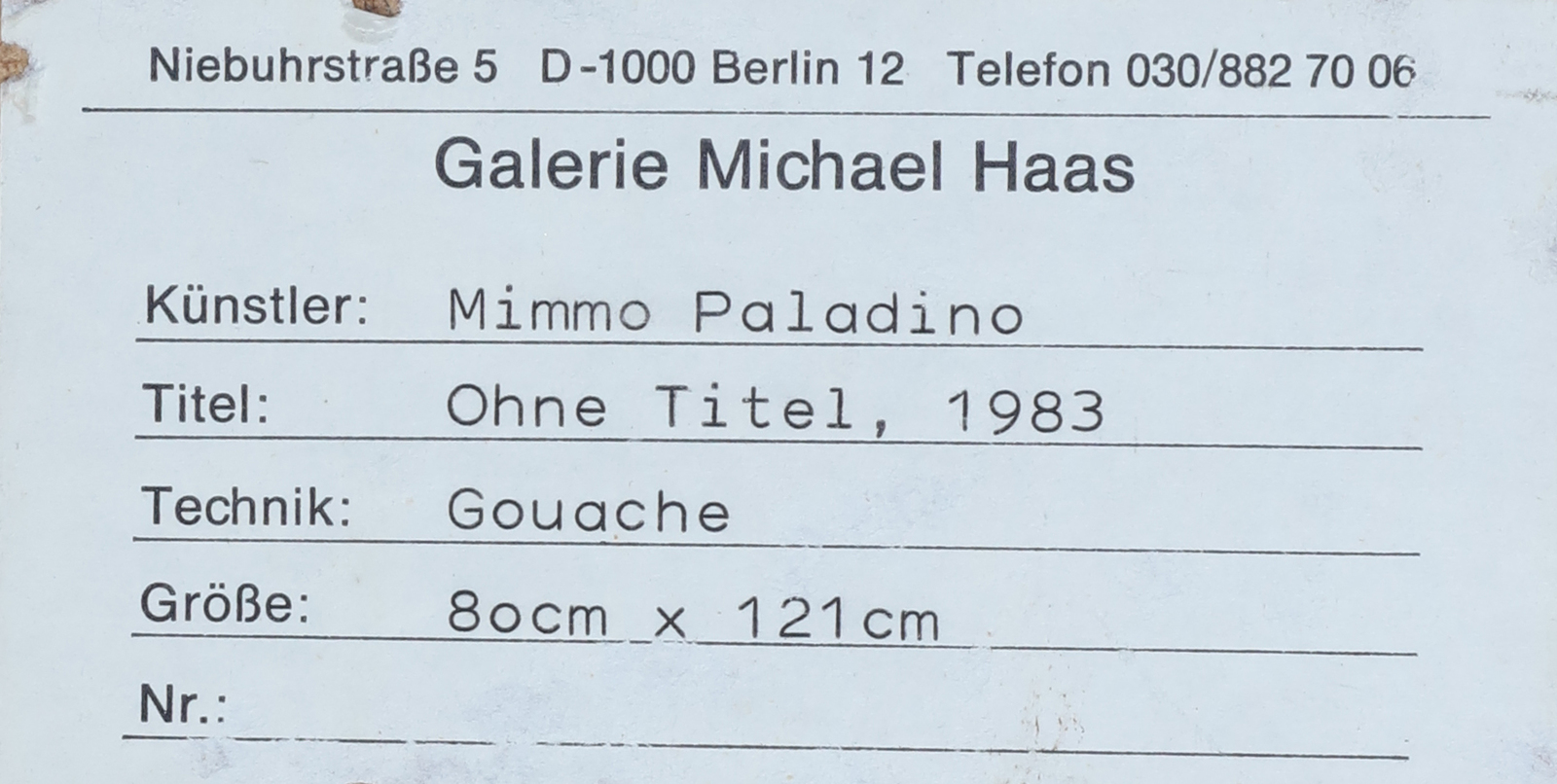 PALADINO MIMMO (n. 1948) Senza titolo. 1983. Acquerello su carta. Cm 120,00 x 80,00. Al retro firma e anno. Cartiglio descrittivo Galerie Michael Haas, Berlino. Provenienza: Galleria Margiacchi, Arezzo; Collezione privata, Arezzo. Cornice presente