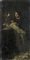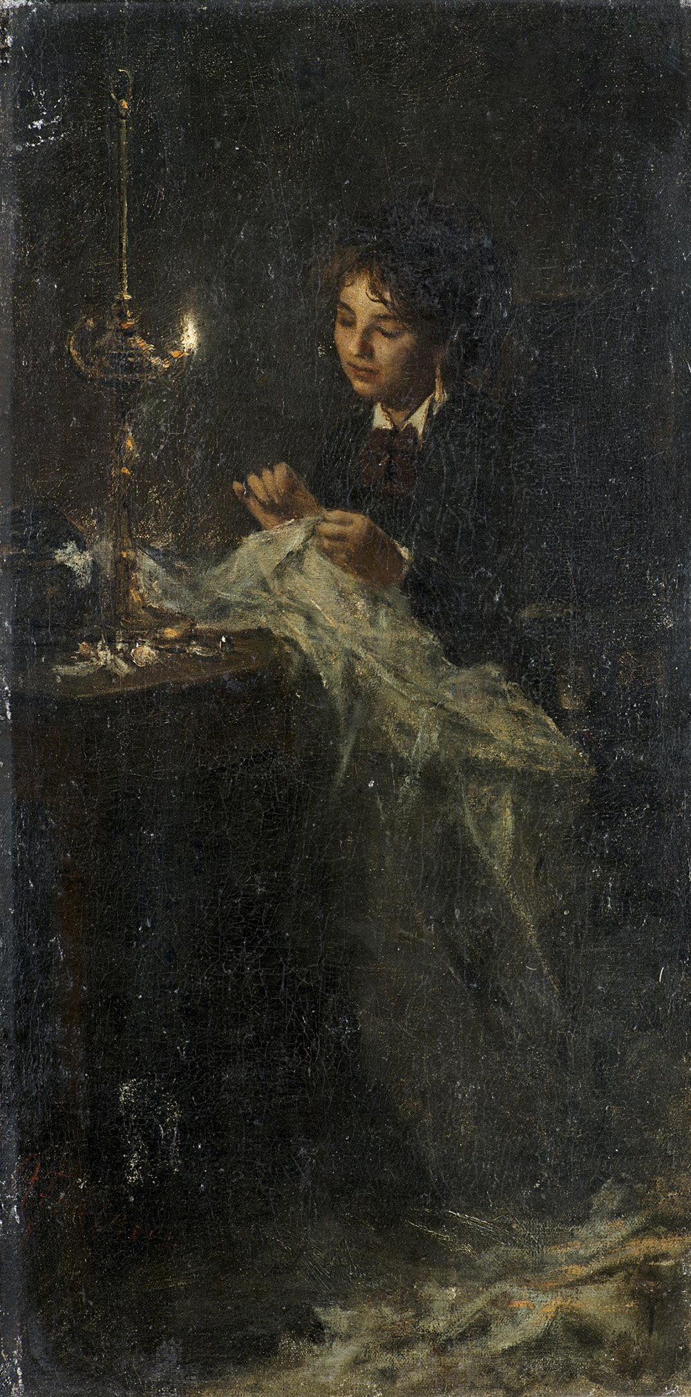 Maestro del XIX Secolo"La ricamatrice" olio su tela applicata a tela (cm...