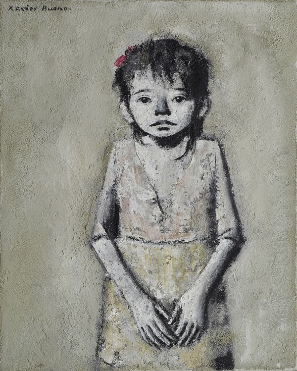 Xavier Bueno (Vera de Bidasoa, 1915 - Fiesole, 1979) Bambina, 1962 Olio su tela, cm. 50x40 Firma in alto a sinistra; al verso: firma dell'autore e timbro ovale delle Galleria Santacroce di Firenze, con n. 3333.