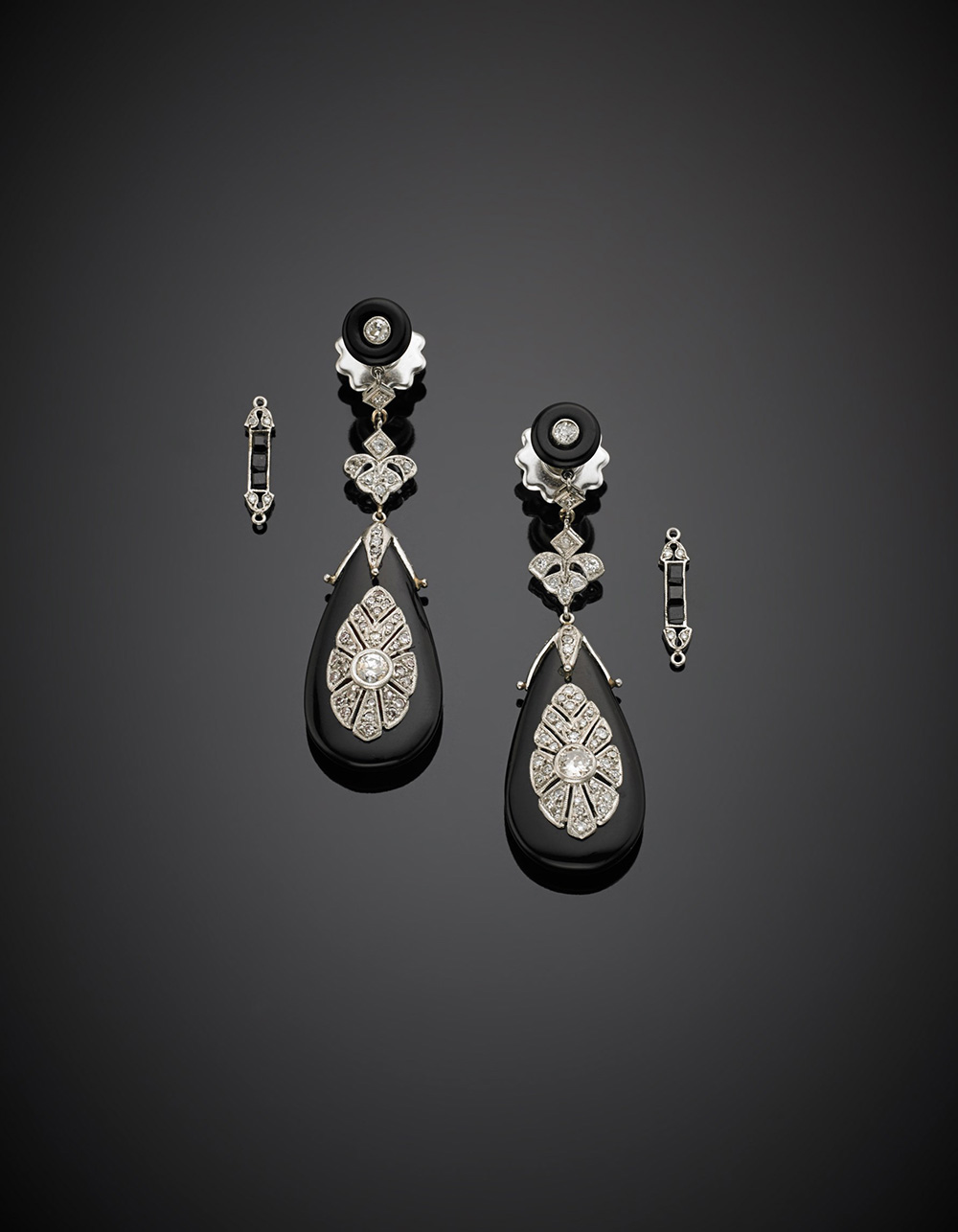 Lot 1016 | Orecchini pendenti in platino, onice e diamanti, chiusura in oro bianco, g...