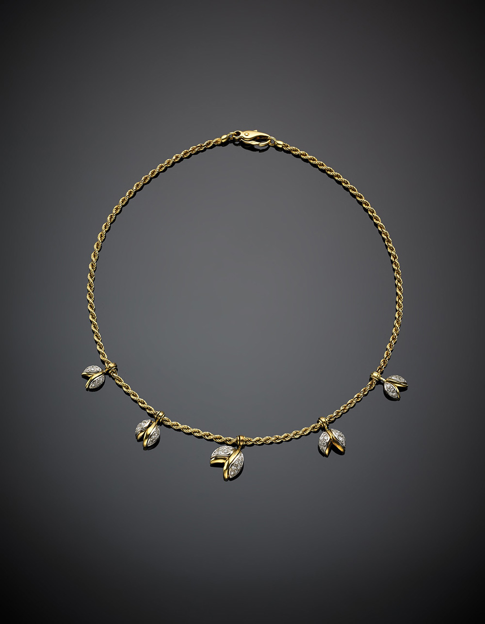Yellow gold interwoven necklace with five bi-coloured gold diamond leaf pendants, g 22.5, length cm 39 circa.