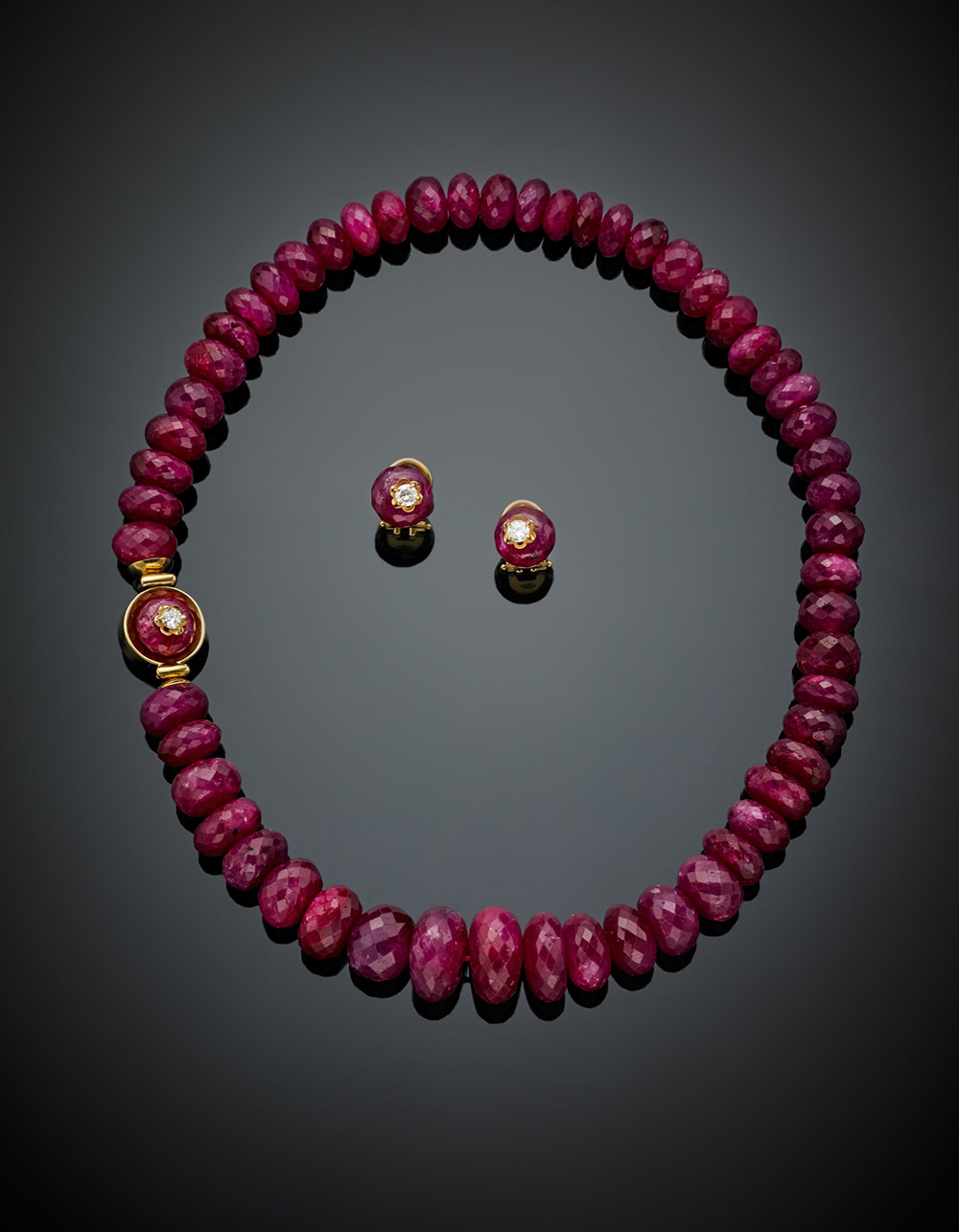 Demi-parure composta da collier ed orecchini a lobo, il collier di rubini scalati e sfaccettati di forma ovaloide da mm 10 a mm 16.50 circa e chiusura in oro giallo e diamante rotondo, orecchini a lobo diam. mm 10.50 circa, per complessivi g 128,60, lungh. cm 40,8 circa. Lungh. collier cm 40.8 circa