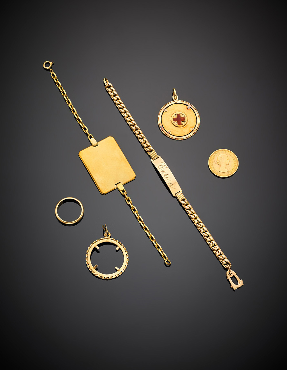Yellow gold lot composed of two bracelets, a wedding ring and two charms, in all g 52.08. (defects)