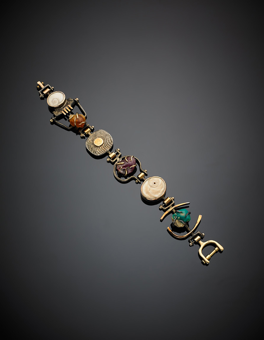 Bracciale in oro giallo, quarzo citrino, quarzo ametista, quarzo microcristallino e conchiglia g 36,10, lungh. cm 18 circa. Firmato A. Pomodoro in corsivo sul retro