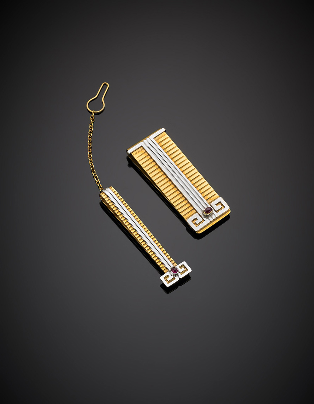 Bi-coloured gold lot composed of a money clip and a tie clip accented with cabochon rubies, in all g 32.80.
