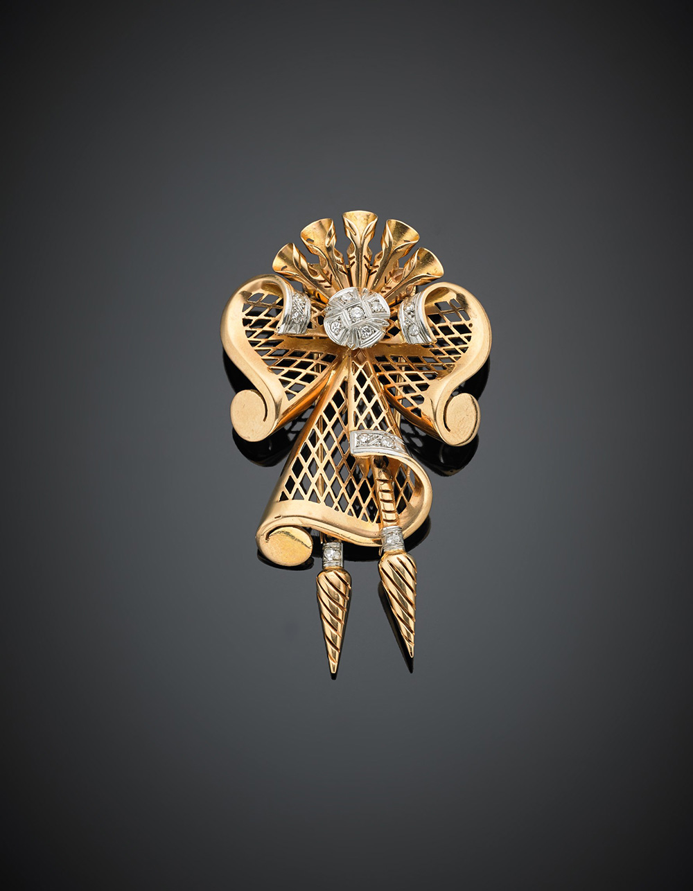 Spilla pendente anni 30 in oro giallo e bianco, diamanti a guisa di fiocco traforato e rifinito con due pendenti g 23,40, lungh. cm 6,90, largh. cm 4,10 circa.