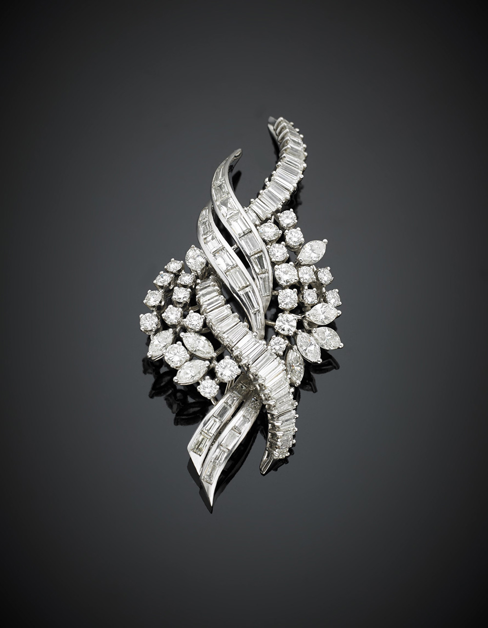 Broche in platino con diamanti rotondi, a navette, baguette e tapered per complessivi ct. 6 circa, g 22,00, lungh. cm 6,80, h cm 3,2 circa.