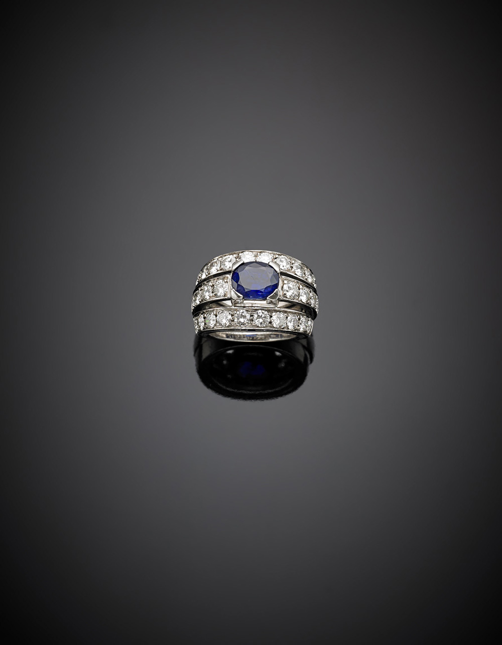 Anello in oro bianco con diamanti rotondi ed al centro uno zaffiro ovale di...