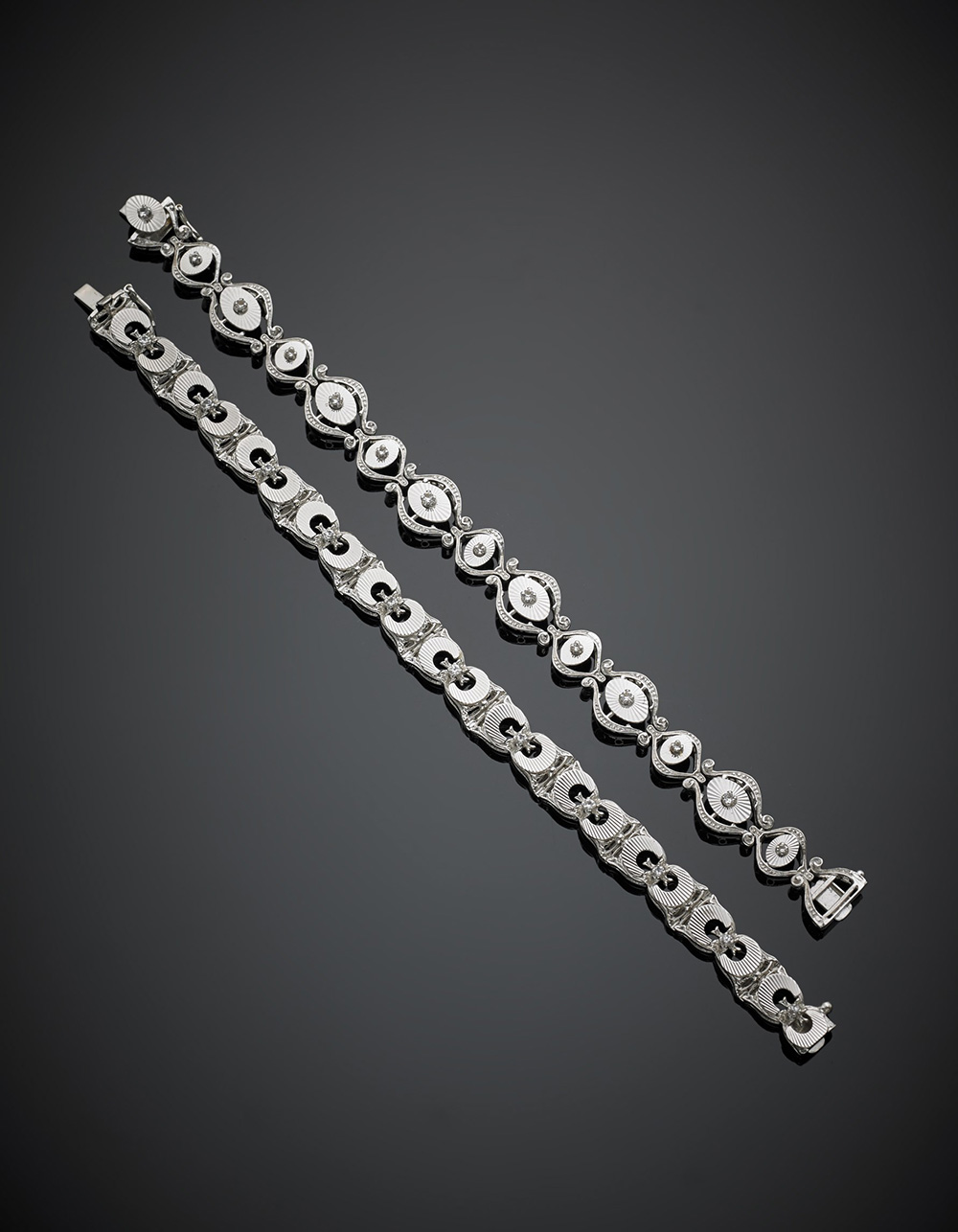 Due bracciali modulari in oro bianco rifiniti con diamanti, per complessivi g 49,80, lungh. cm 19 circa. Uno marcato UNOAERRE
