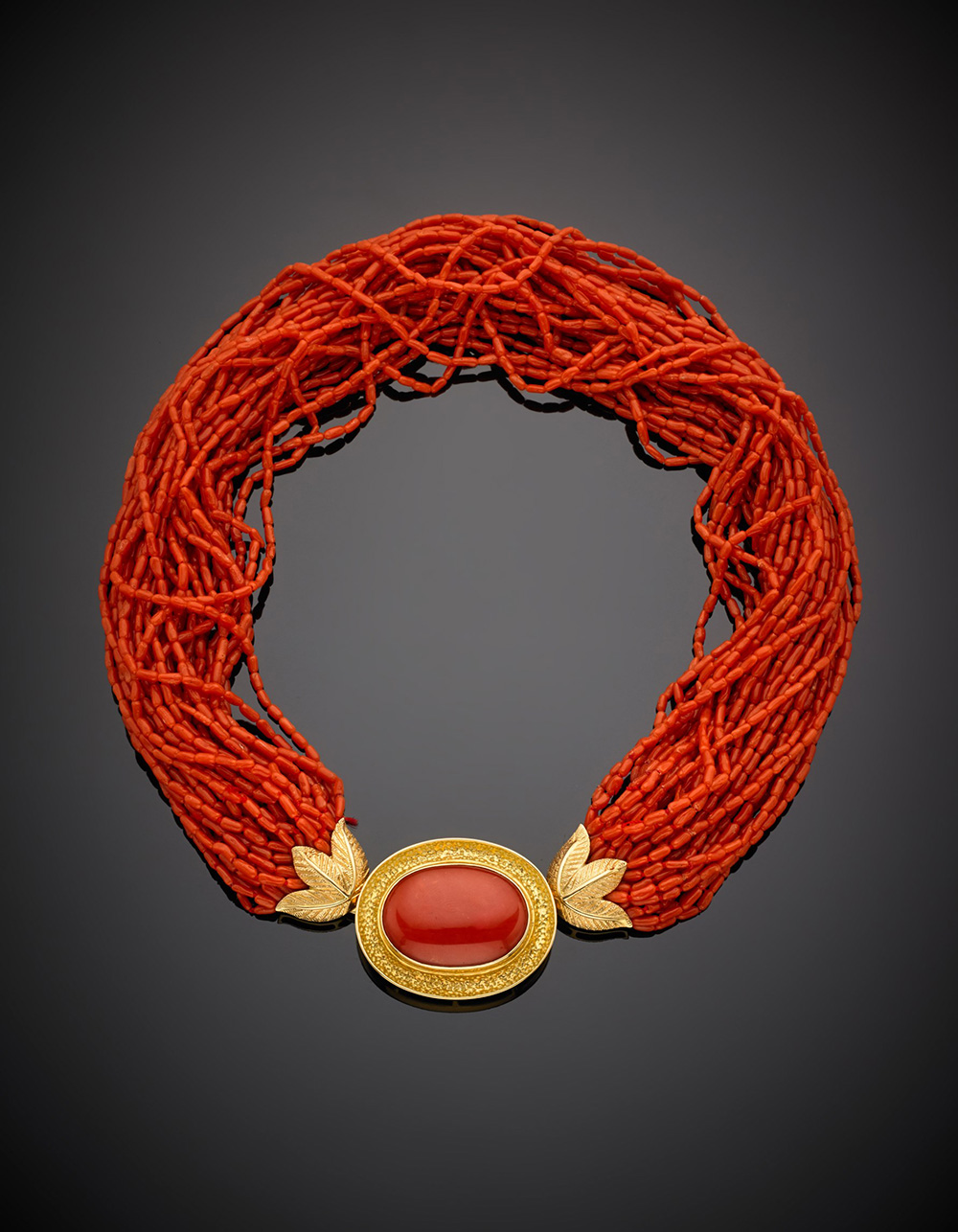 Lot 1103 | Collana multifili in corallo rosso, chiusura in oro giallo e corallo, g...