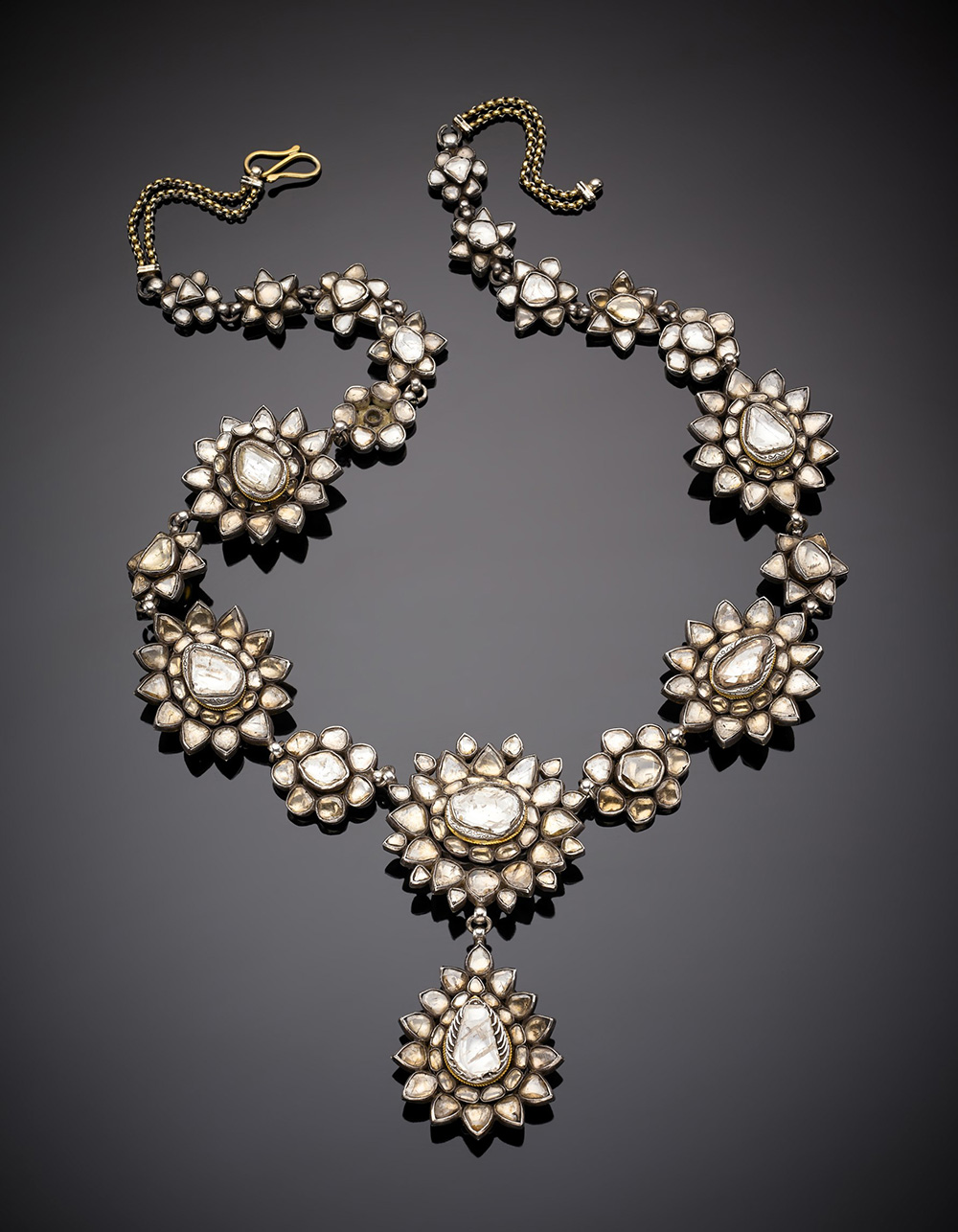 Collier in oro giallo e argento con diamanti irregolare e flat a formare una fila di fiori a scalare e rifinito con un pendente, g 294,60, lungh. cm 75,50 circa. (difetti e mancanze)