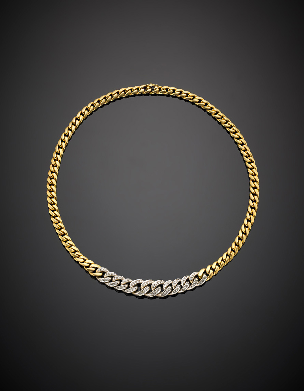 Collier a scalare a maglia groumette in oro giallo e bianco rifinita al centro con diamanti rotondi g 64,45, lungh. cm 41 circa.