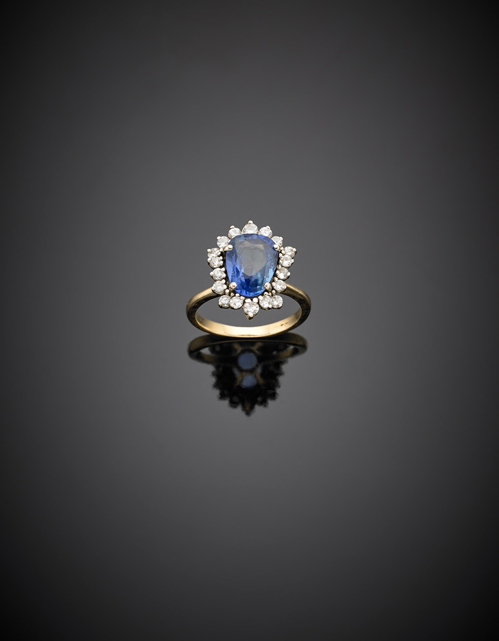 Anello in oro giallo e bianco con zaffiro forma fantasia di ct. 2,80