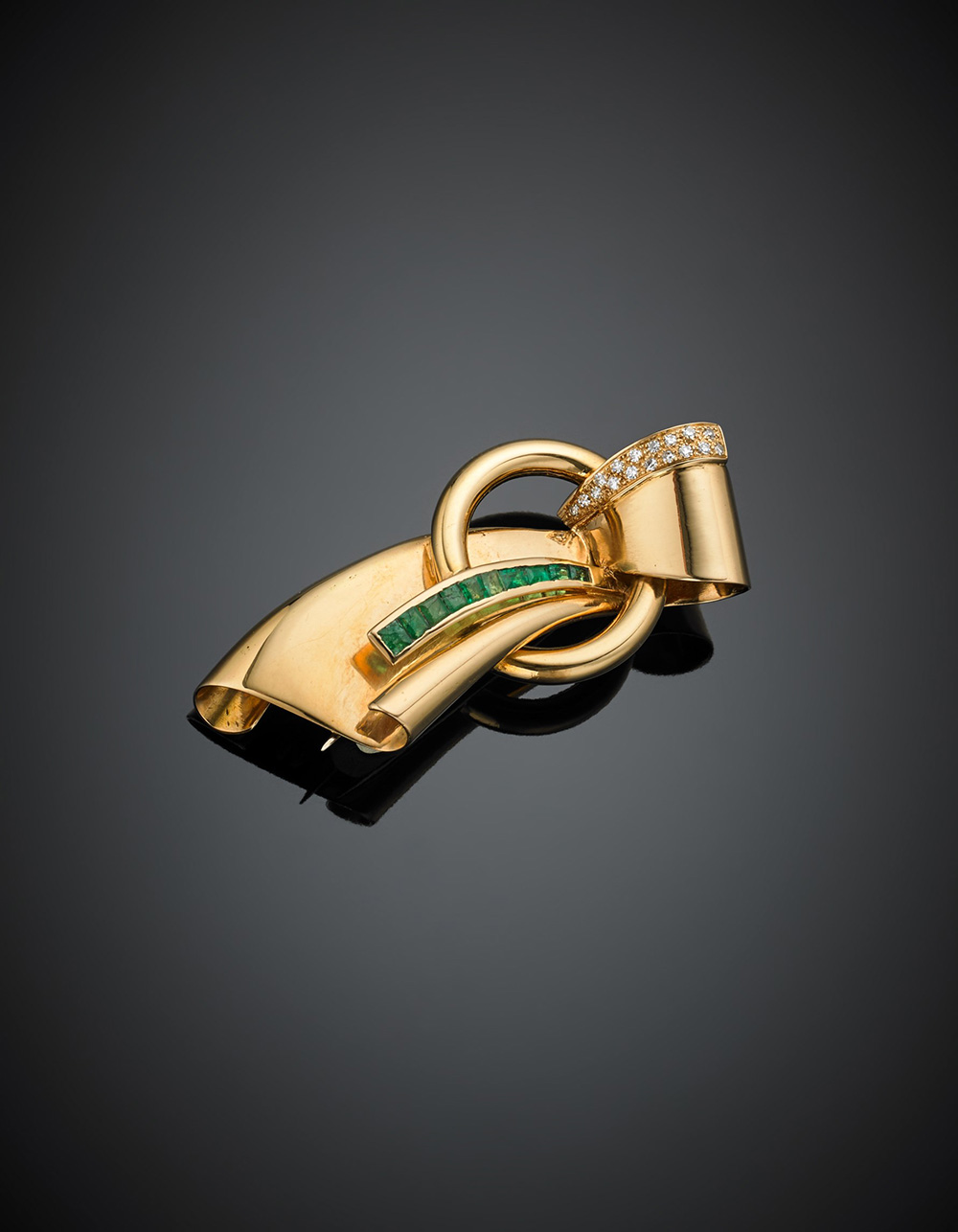 Bi-coloured gold with round diamonds and carrè-cut emerald clasp and bow brooch g 25.04, length cm 6.50 circa.