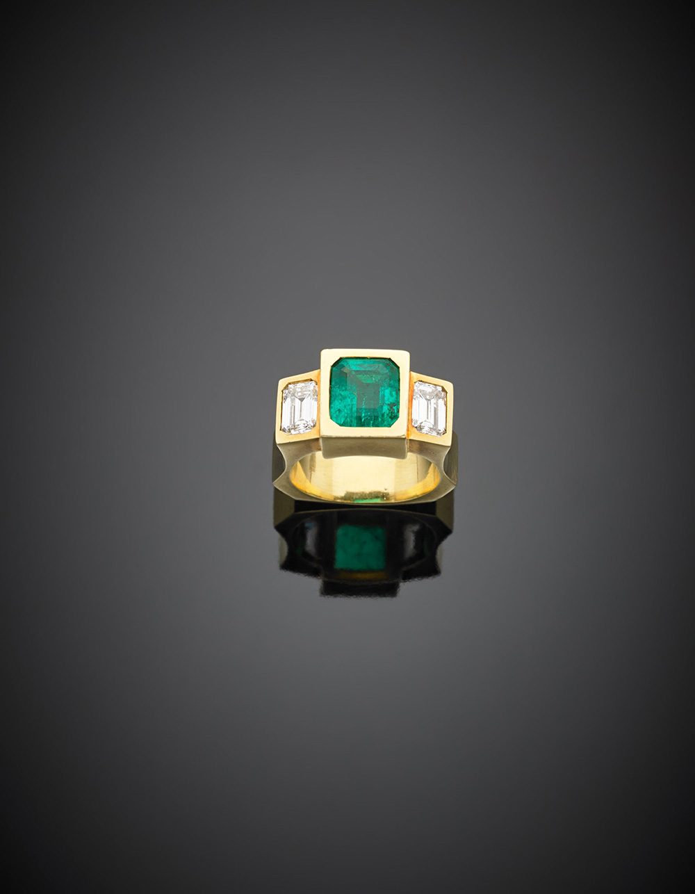 Anello in oro giallo con smeraldo centrale ottagonale di ct. 3,15 con ai due lati due diamanti ottagonali, per complessivi ct. 1,80 circa, g 19,00 misura 17/57. Con custodia originale Falliva Panizzi Milano