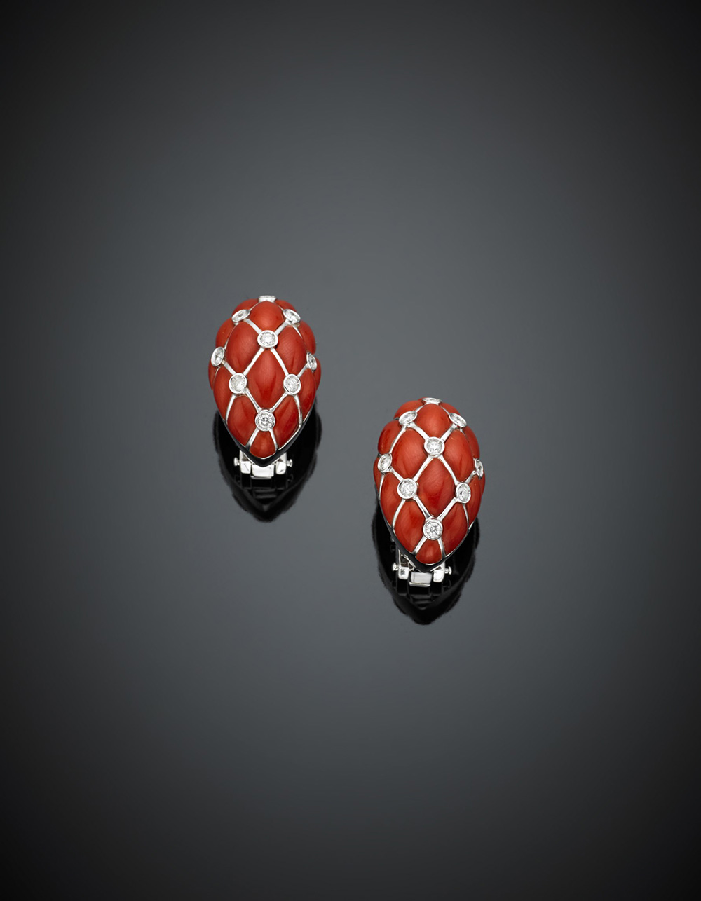 Lot 1128 | *Orecchini a lobo in oro bianco rifiniti con mosaico di corallo rosso e...