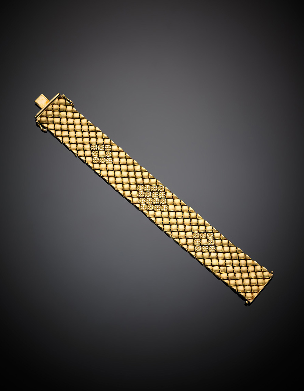 Bracciale a fascia articolata in oro giallo lucido e satinato, g 60,17, lungh. cm 18,50, largh. cm 2,30 circa.