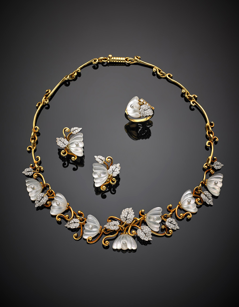 Demi-parure floreale in oro giallo composta da collier, orecchini ed anello con rifiniture in quarzo ialino, madreperla e diamanti su oro bianco., complessivi g 92,52. In custodia originale