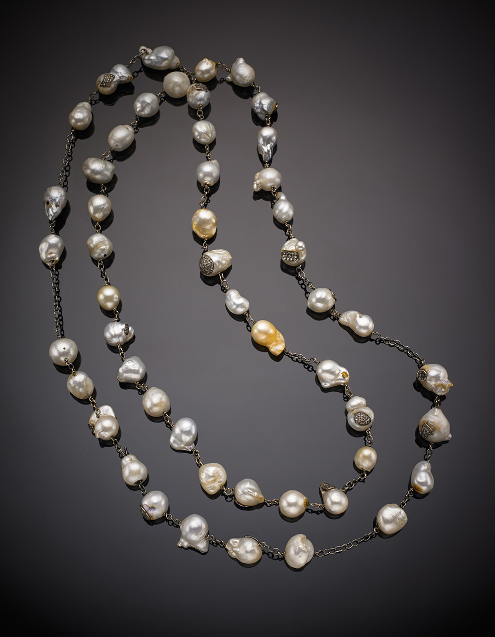 Lunga collana di perle South Sea barocche con intarsi in oro rodiato nero a pavè di diamanti neri distanziati da catena g 299, lungh. cm 170 circa. (difetti e mancanze)
