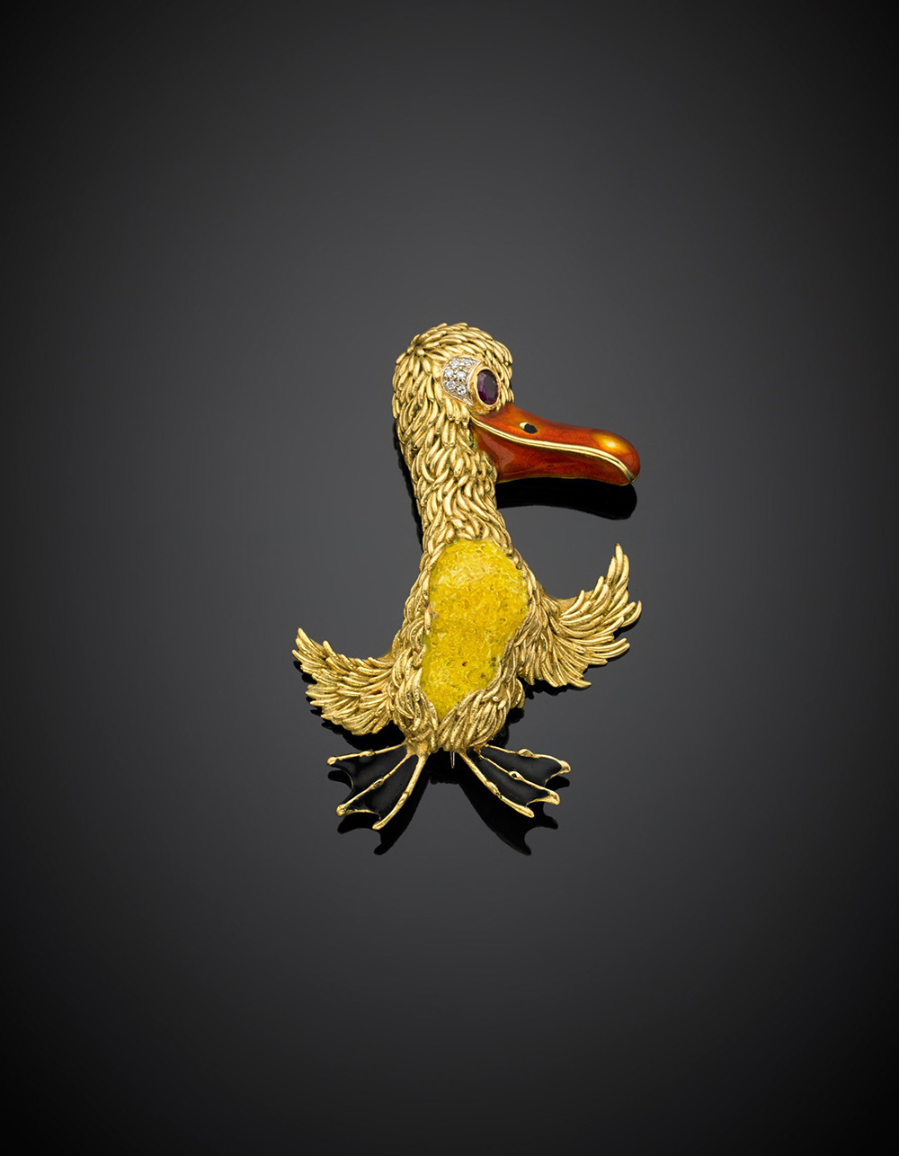 Broche a guisa di papero in oro giallo, smalti, rifinito con diamanti e rubino, g 36,66, lungh. cm 6,90, largh. cm 4,40 circa. (difetti)