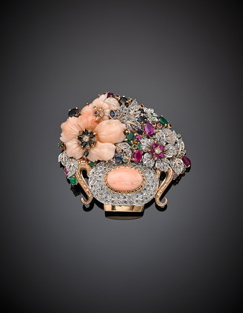 Broche a forma di vaso fiorito in oro rosa 333/1000 e argento con corallo rosa, diamanti, rubini, zaffiri e smeraldi g 77,50, largh. cm 8 circa.