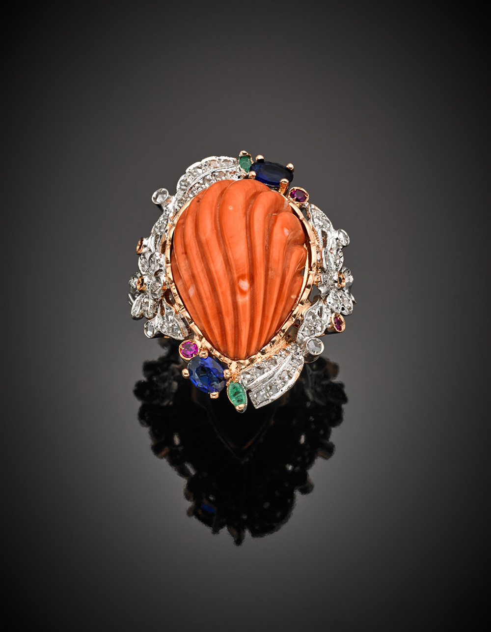 Anello in oro rosa 333/1000, argento, al centro un corallo rosa arancione scolpito rifinito con diamanti zaffiri, rubini, smeraldi g 22,10 misura 18/58.