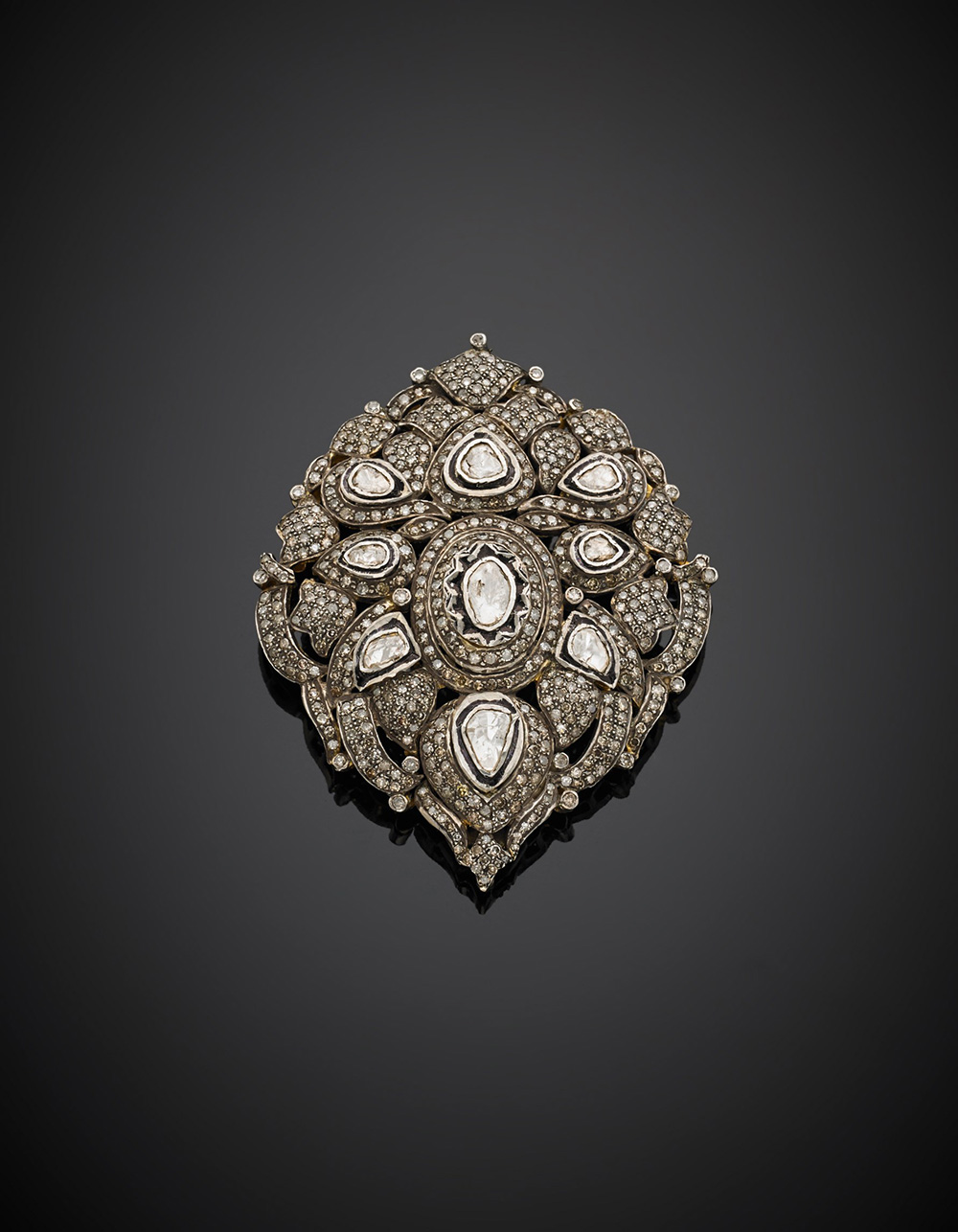 Fermaglio/pendente "indiano" in oro e argento con diamanti flat, irregolari e huit huit, rifinita in smalto nero, g 25,55, lungh. cm 6,30, largh. cm 5 circa.