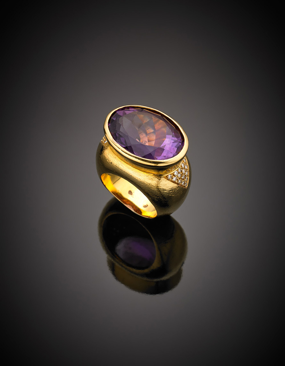 ANGELA PUTTINI - CAPRIAnello in oro giallo con grande ametista ovale taglio...