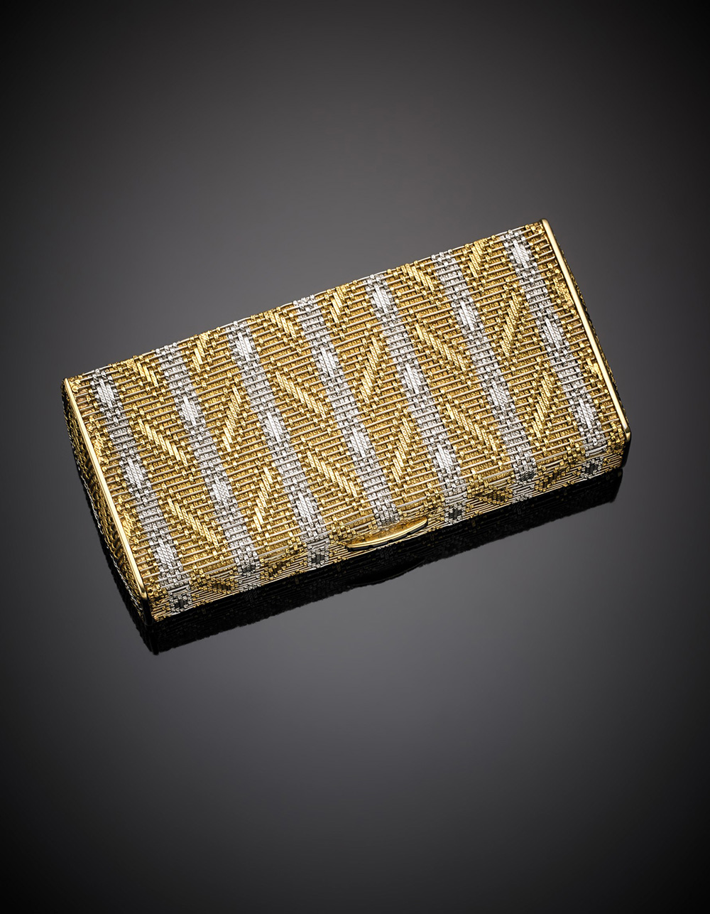 *Bi-coloured gold openwork basket weave box, baguette sapphire on the clasp, g 120.55, length cm 10.70, width cm 5, h cm 2 circa.