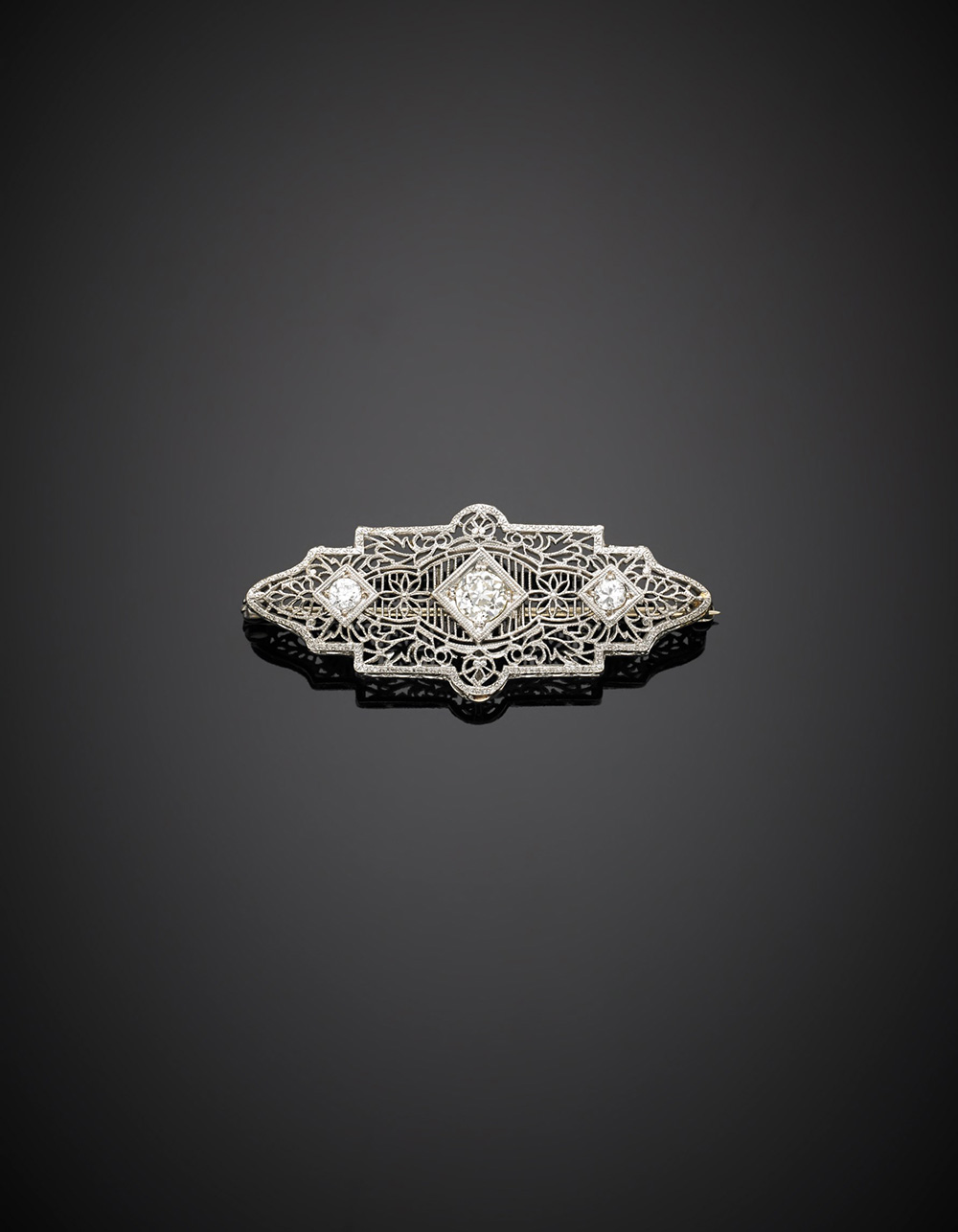 Spilla in oro e platino a filigrana con tre diamanti, il centrale di ct. 0,80 circa e ai lati di ct. 0,22 circa cadauno, g 4,50.Platinum filigree brooch with three diamond, the central ct. 0.80 circa and the others ct. 0.22 circa each, g 4.50.