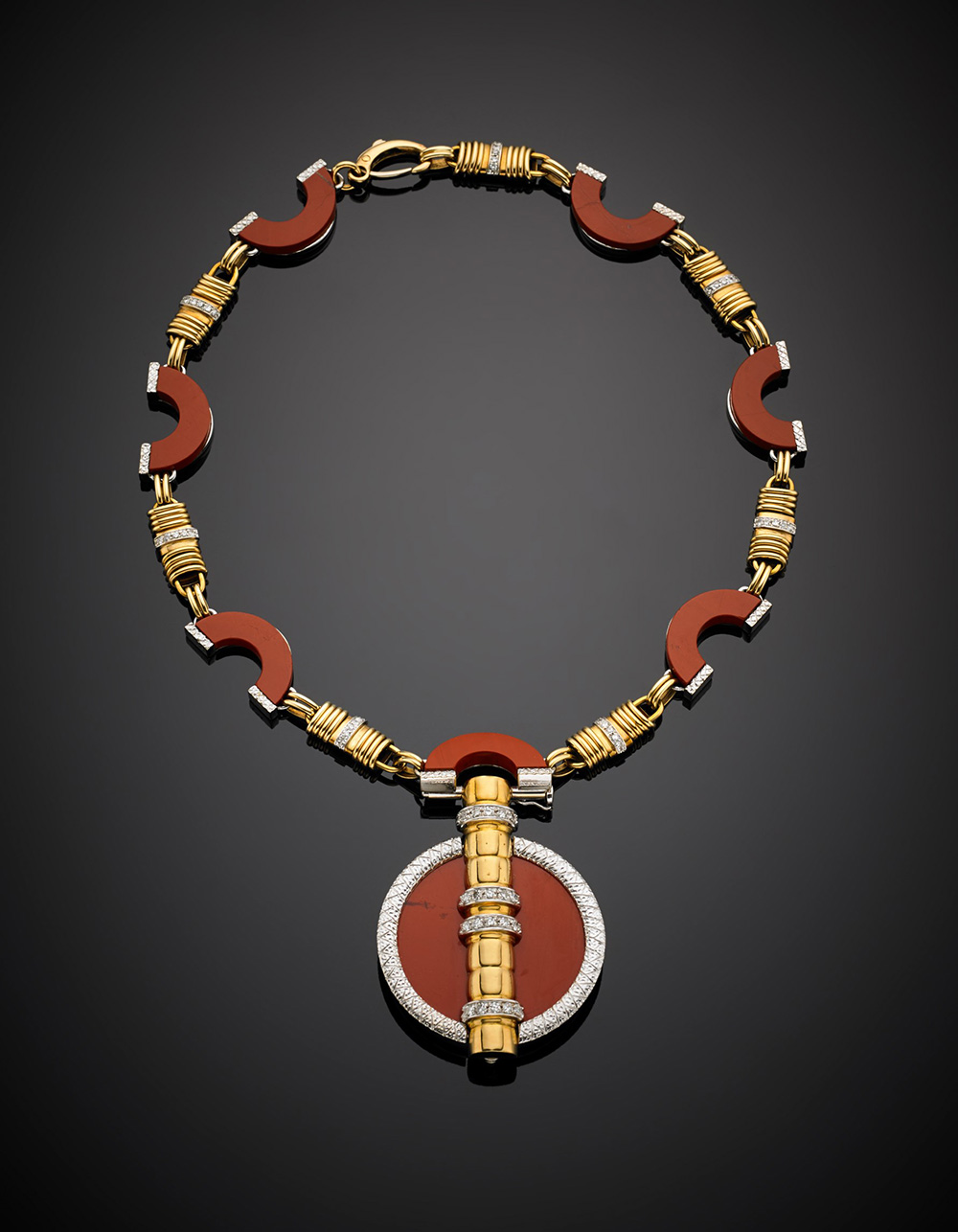 Collier in oro giallo e bianco, diaspro sanguigno tagliato, rifinito con diamanti, g 127,31, lungh. cm 44 circa. Firmato DE VECCHI In custodia originale
