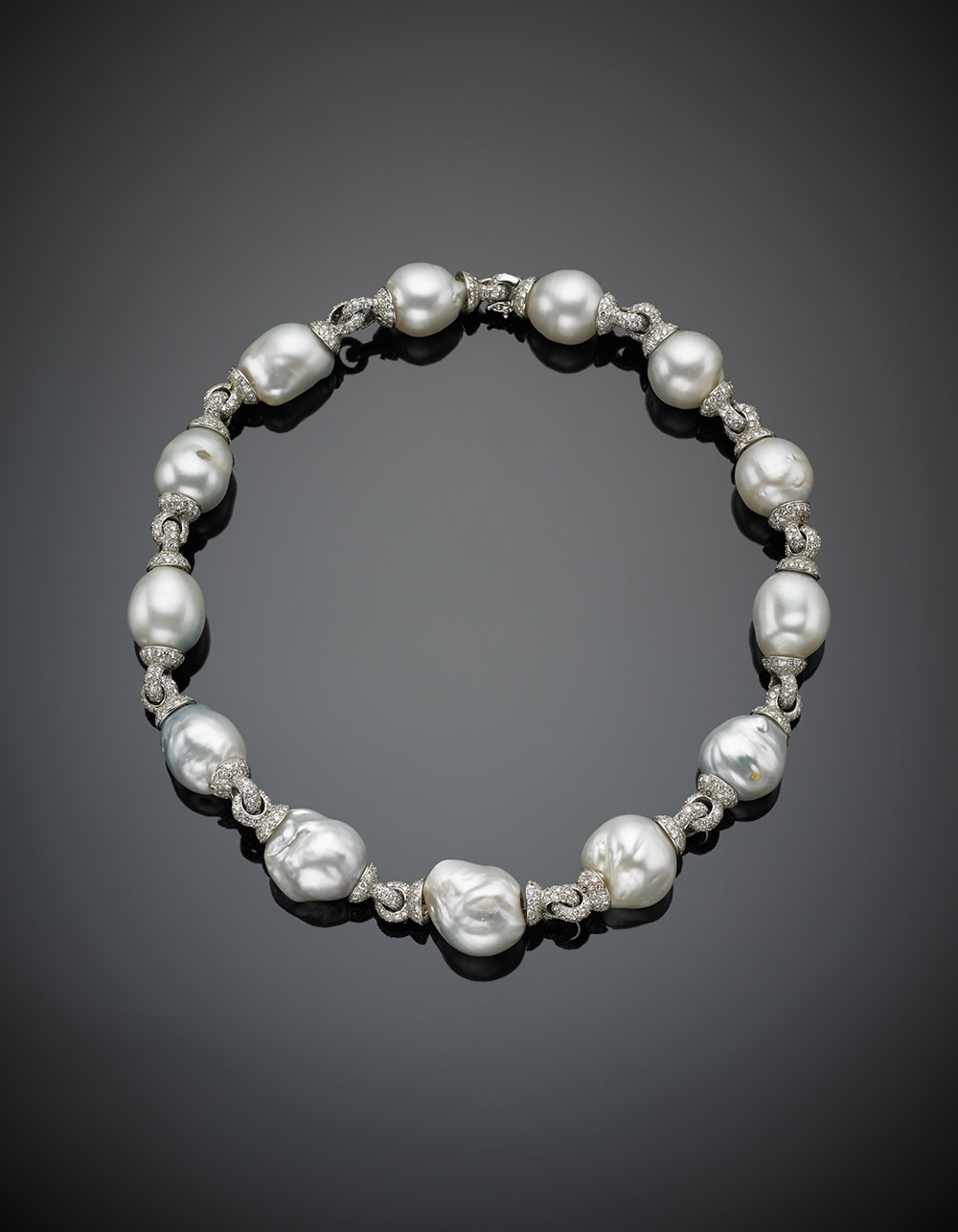 Collier di perle irregolari South Sea da mm 15.47 a mm 18.90 rifinito in oro bianco e diamanti, g 131,80, lungh. cm 43,00 circa.