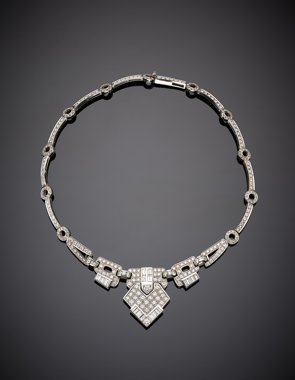 Collier a moduli geometrici in oro bianco con diamanti rotondi e a baguette, per complessivi ct. 10 circa g 43, lungh. cm 37,5 circa.