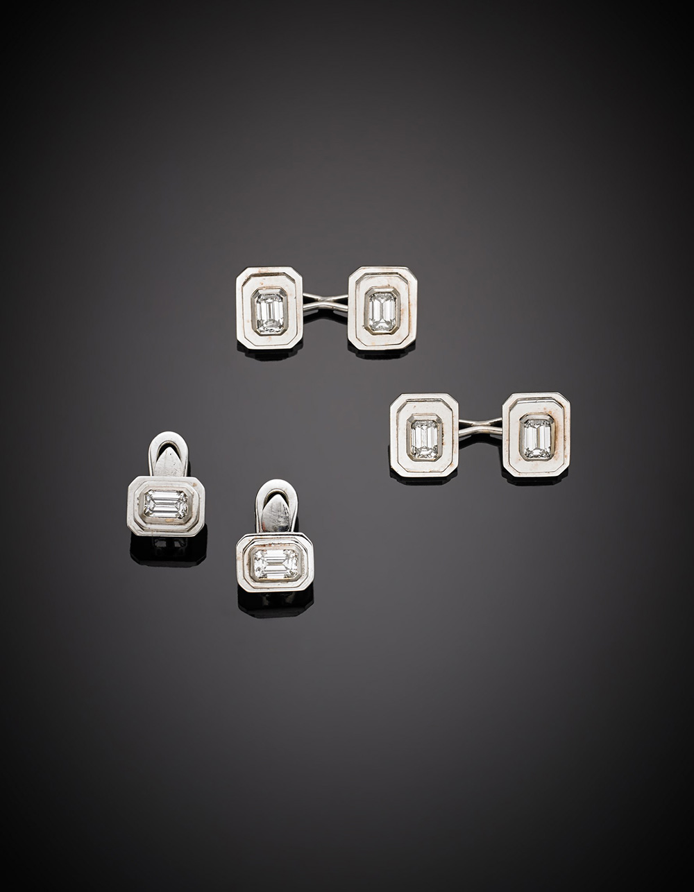 Gemelli e bottoni in oro bianco e diamanti taglio a smeraldo complessivi ct.2,70 circa, g 16,14.